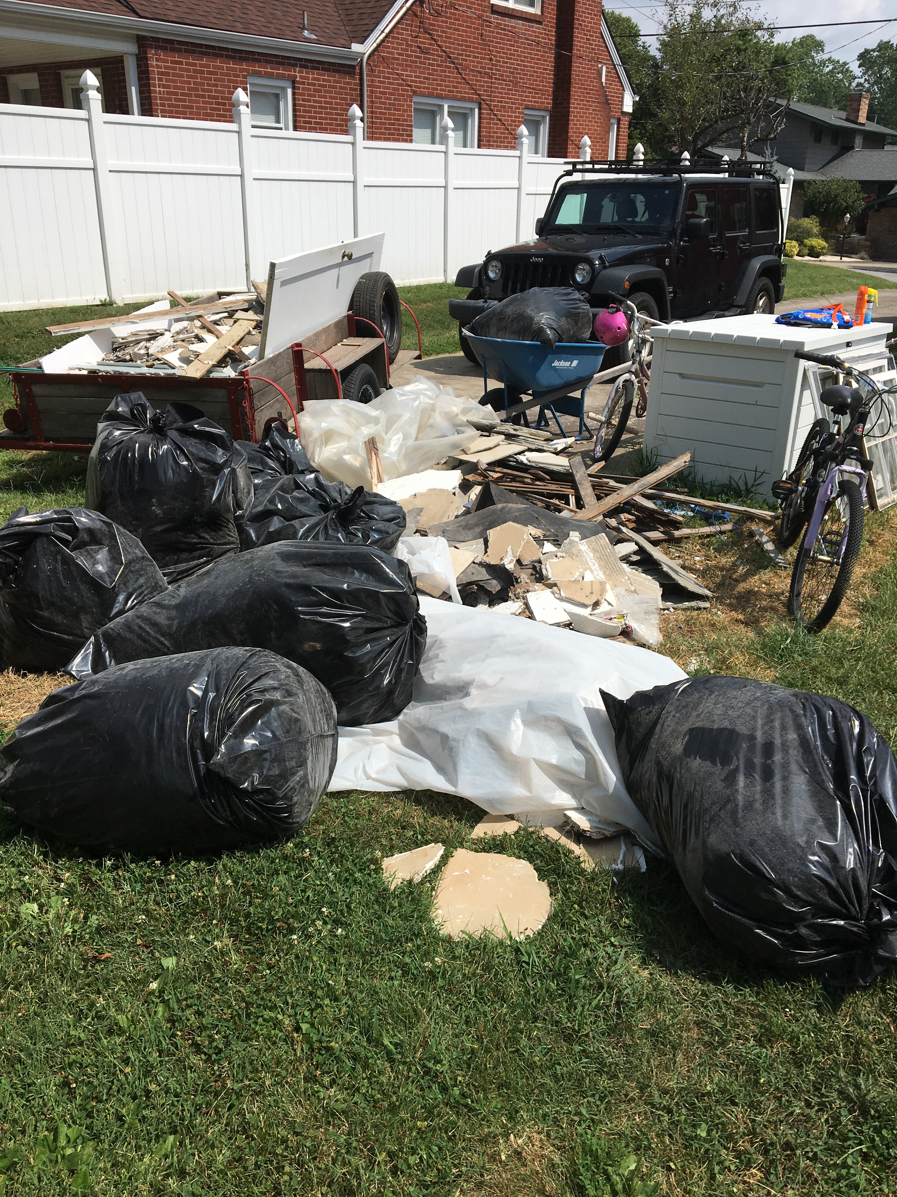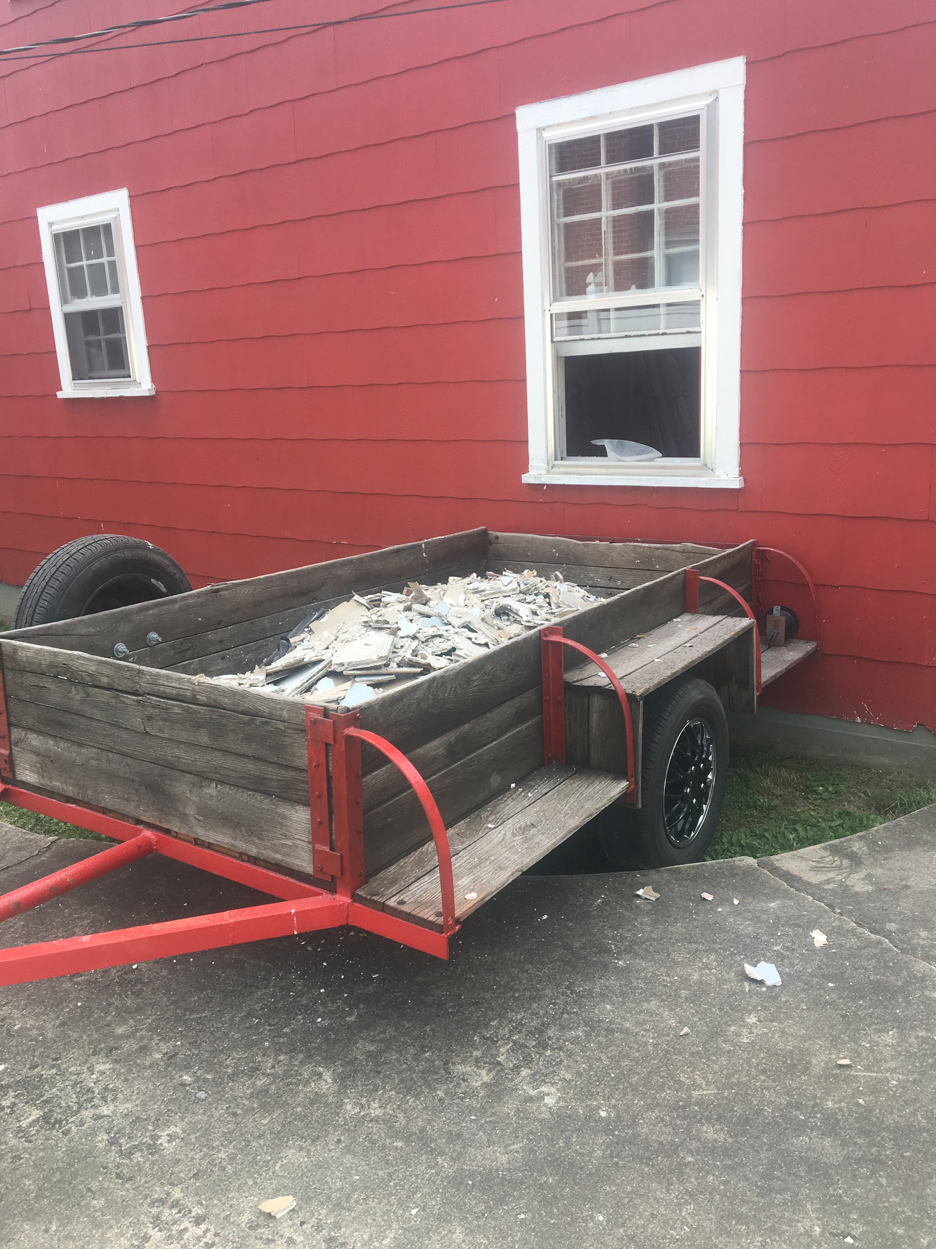 5. Removing the chimney. It was an old coal shoot and never a fire place. Otherwise, I would have lobbied on behalf of the fire place. Or maybe not…it was blocking a large empty space in our future kitchen. Ultimately, removing the chimney was a total “P in the A” and it felt like it took FOREVER!! Especially when I was the lone eliminator of said bricks! Yes that’s correct folks, it took me 15 trips to our local dump to remove the trailer below filled with bricks.